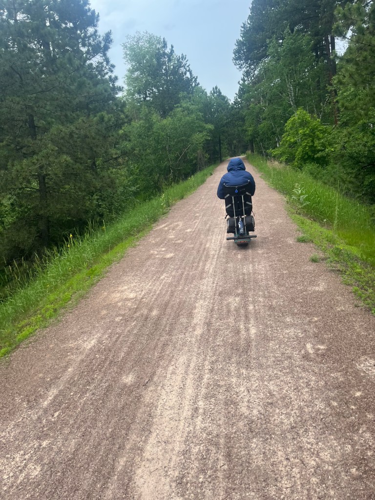 Then Josiah checked the battery percentage on his Onewheel. It was lower than he had hoped. “I don’t know if it’ll make it,” he said, “with all the climbing.”. The Onewheel chair, as a machine that defies explanation, was truly a sight to see on this trail. Even the trail rangers had commented on it at the Deadwood trailhead. But it apparently did have an Achille’s heel; the combined strain of a sustained uphill and the added weight of a bag, plus Josiah’s beast Haku. He considered the situation some more. “If the road’s close enough, I’ll hitchhike,” he said, and with that Plan B in place, we continued on.