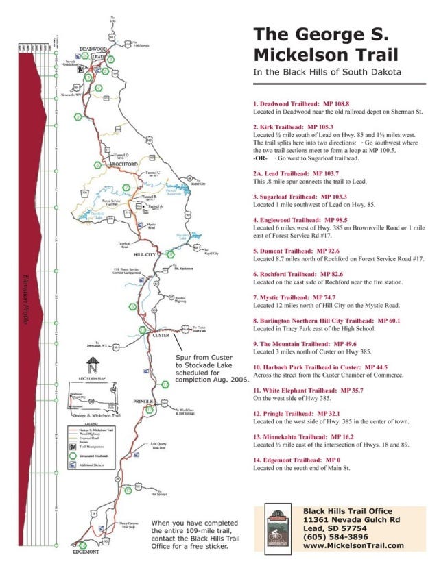 The next morning, we got ready for the shuttle up to Deadwood. The northern point of the trail, according to the elevation profile, was the highest point. From there it would be a net downhill back to Edgemont and the car. The plan was to finish in two days, which seemed very possible.