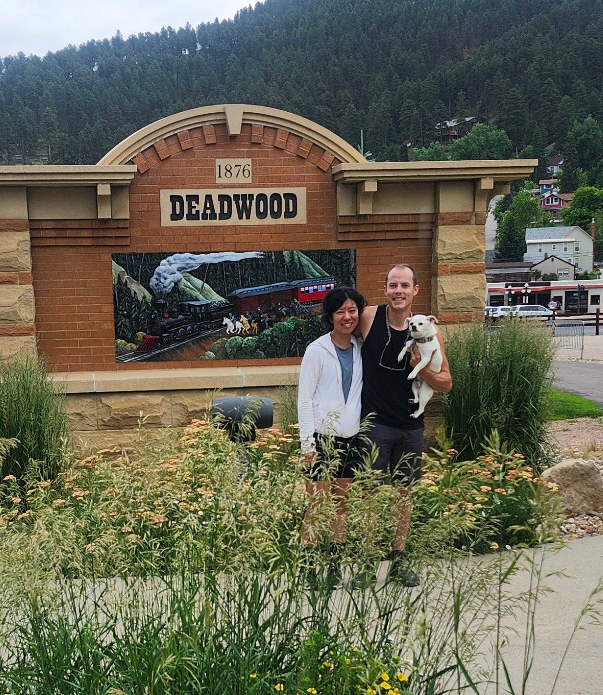 Our shuttle driver met us at the trailhead and loaded up our machines. The two hour drive was scenic and drizzly, passing through Wyoming. The hum of the motor and road was incredibly soothing. I dozed off at some point, and woke up to the cutest roadside scenery; greenery and houses built on hills. We passed through Lead, SD on the way to the Deadwood trailhead. My anticipation continued to grow as we arrived at the trailhead, taking in all these new surroundings. After a quick breakfast, restroom visits, and a photo op, we were on our way. We were doing the freaking Mickelson Trail!!